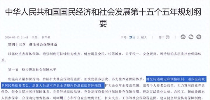 今年3月,十五五规划纲要里关于养老金这块,写得很明确——要完善基本养老保险全国统筹制度,健全待遇的确定和调整机制。更值得关注的一句话是,退休人员基本养老金调整要向待遇较低群体倾斜。这话放在以前的文件里也提过,但写进五年规划纲要,分量就不一样了。2026年是十五五开局之年,养老金怎么调,大方向已经定了。